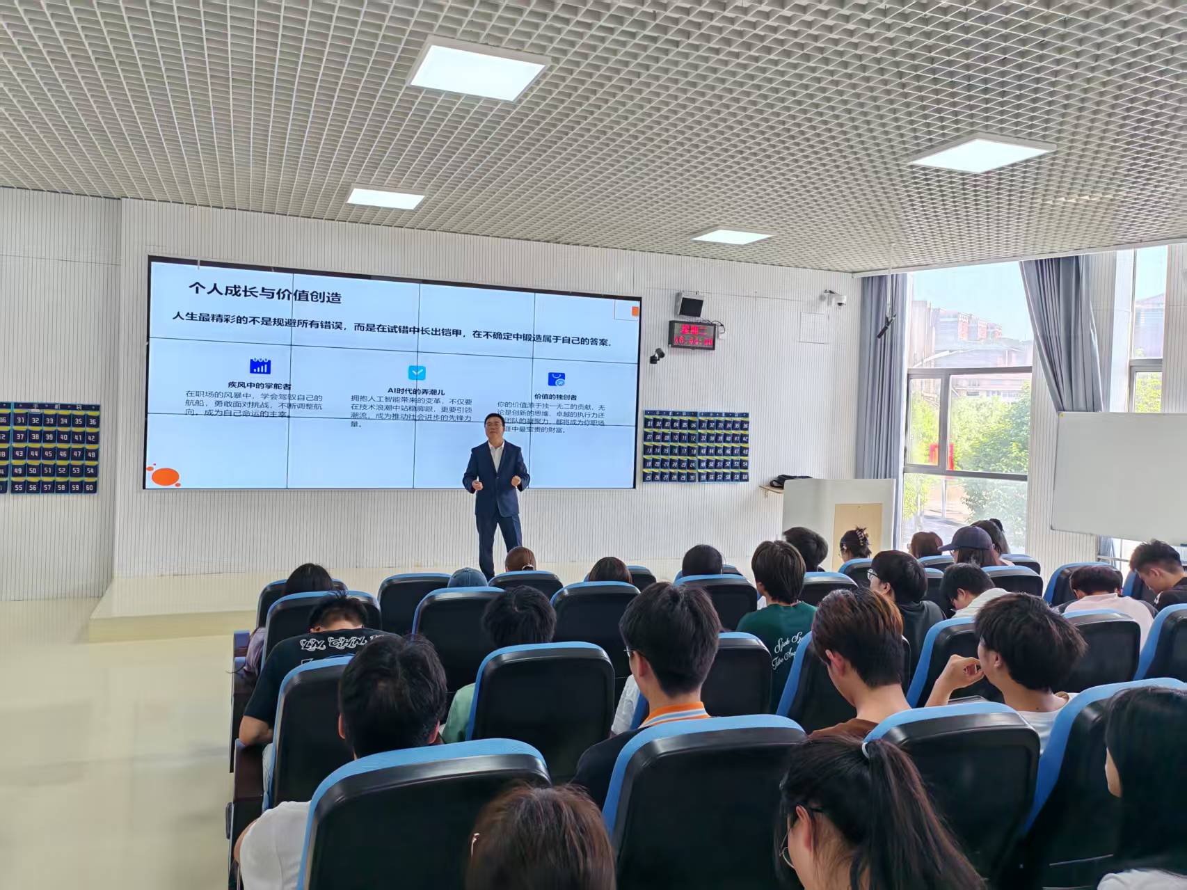 施凯以“预见未来—在不确定时代构建职场竞争力”为主题,首先介绍了如何用战略思维规划职业。其次,从简历设计的"爆款逻辑"、面试博弈的底层逻辑、offer选择的黄金标尺以及县域城市就业攻略等方面阐述了如何用营销思维赢得机会。最后,结合自己亲身经历讲述了如何用成长思维塑造价值。