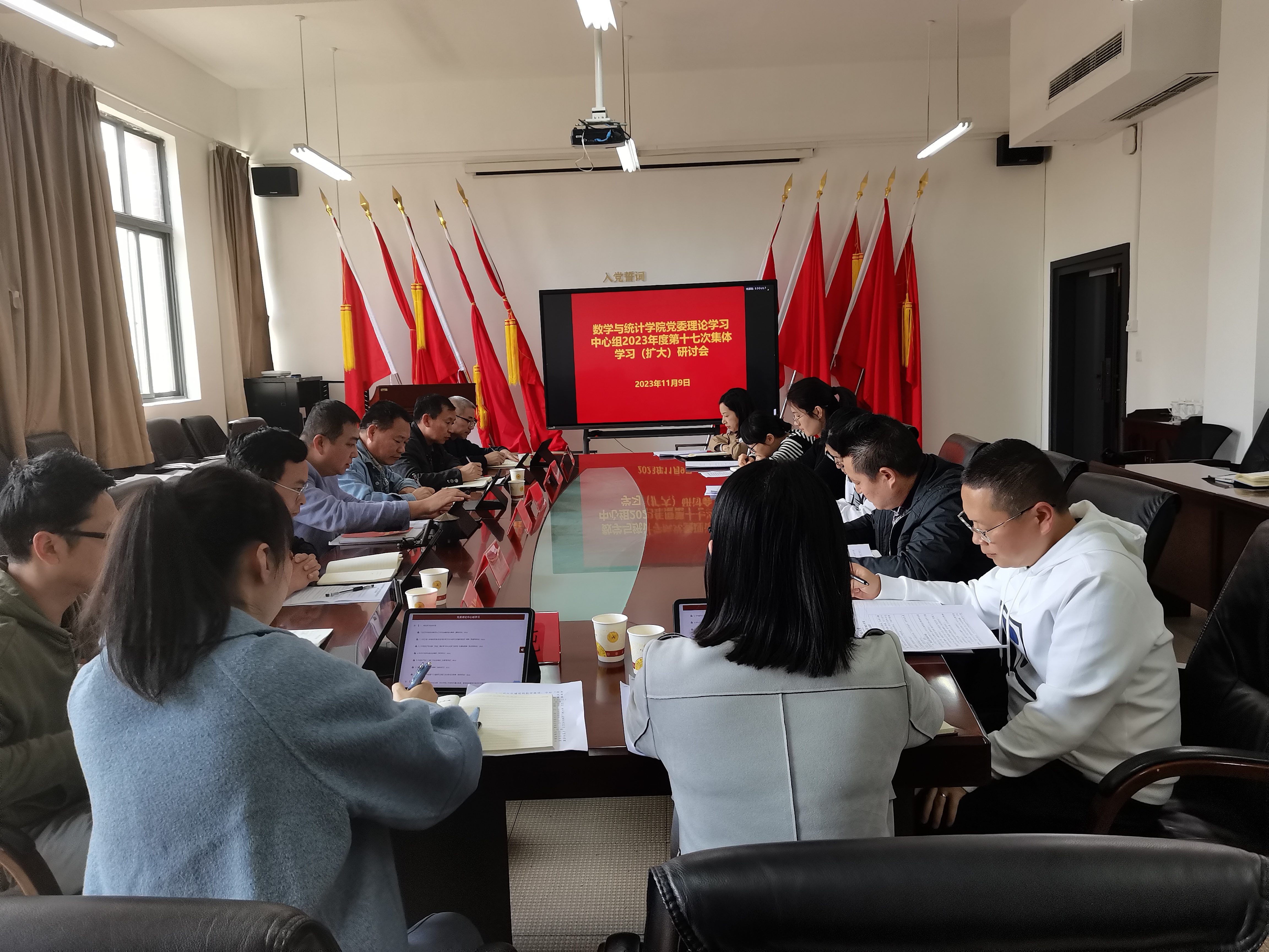 11月9日下午,数学与统计公司党委理论学习中心组在志学楼331会议室召开2023年度第十七次集体学习(扩大)研讨会,公司党政领导班子、各科室负责人参加,公司党委书记虞帆主持会议。