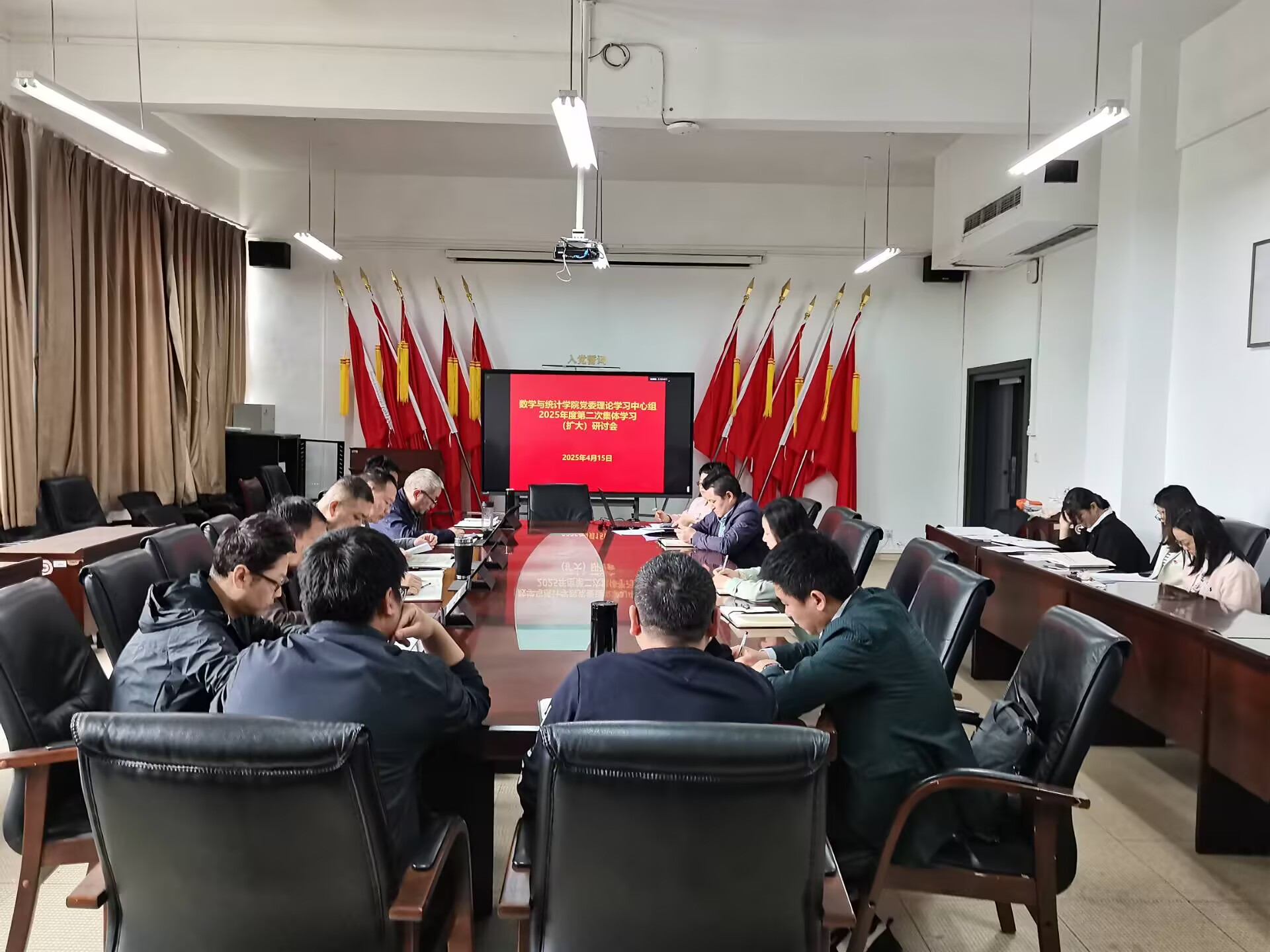 4月15日下午,数学与统计公司党委理论学习中心组2025年度第二次集体学习(扩大)研讨会在志学楼331会议室召开。公司党政领导班子、各科室负责人、各支部书记、各系主任参加,公司党委书记虞帆主持。