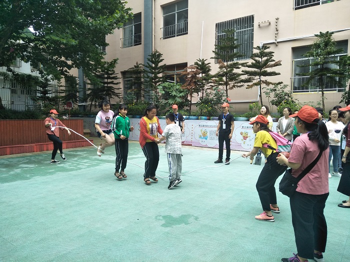 在与小朋友的互动环节中,志愿者们表演了精心准备的节目,然后带领着小朋友一起开展跳长绳、投篮等小游戏,最后分发小礼物,给小朋友们带来了欢乐。