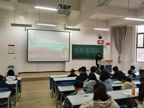 2021年11月30日下午,2021级全体员工在进学楼阶1-1教室学习了党的十九届六中全会精神。