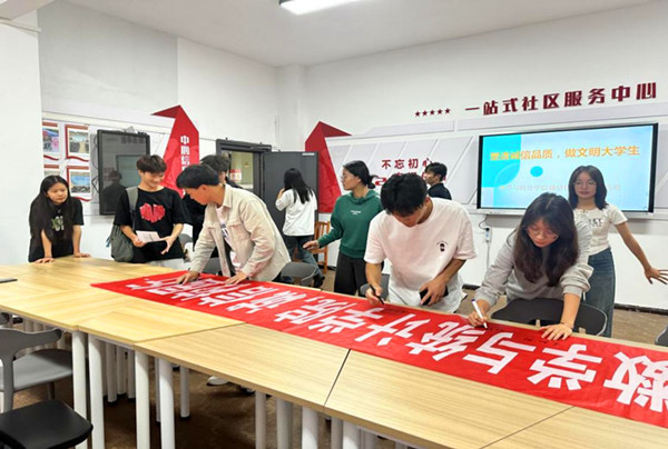 座谈会结束后,全体同学在诚信校园行横幅上签名并合照留念。通过此次座谈会和签名仪式,同学们纷纷表示都有很大的收获,将在今后的学业生涯里更加努力,以一颗爱国感恩的心继续前行。