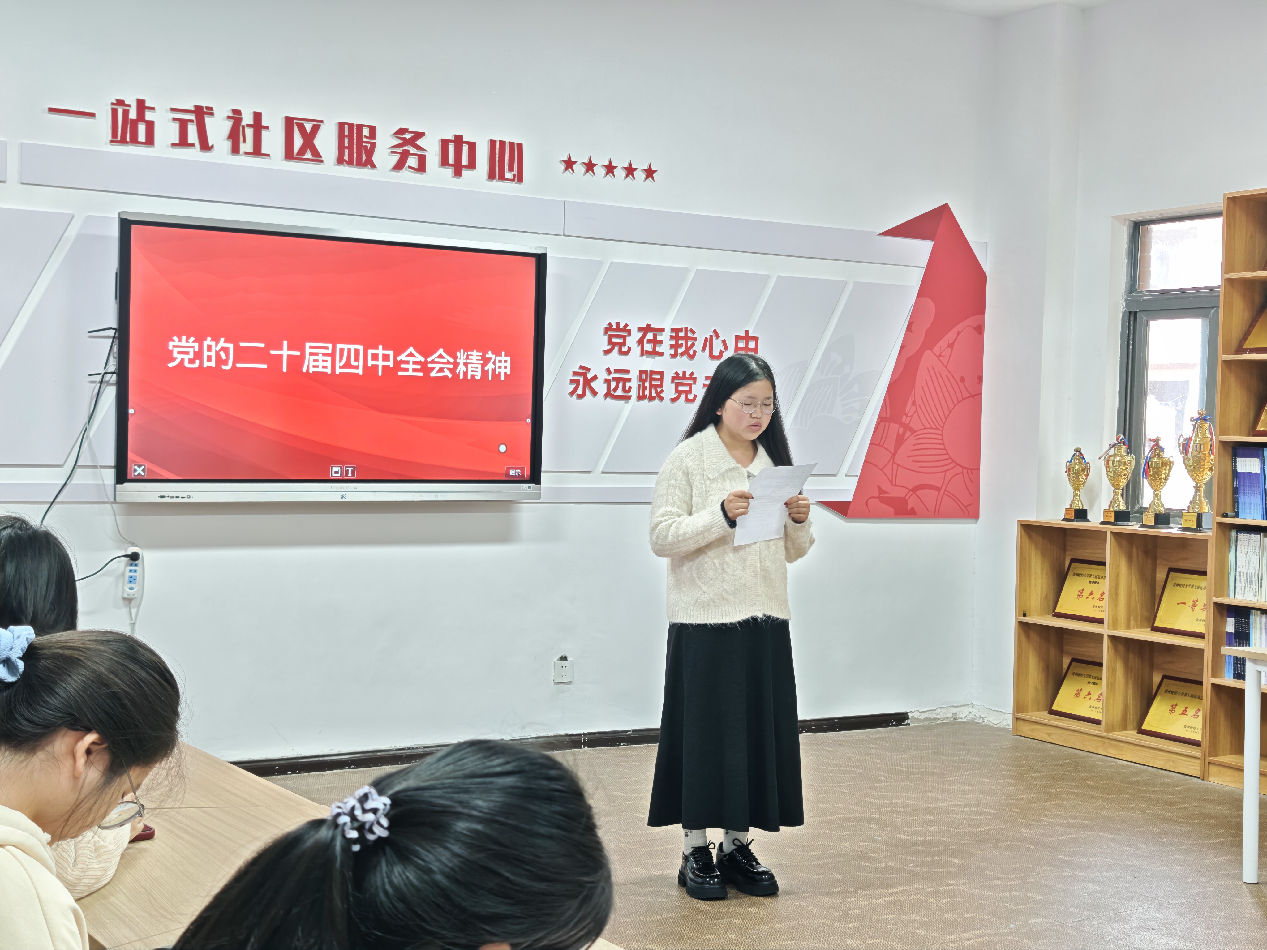活动中,同学们以“青年视角看全会”为切入点,结合实际对党的二十届四中全会精神进行学习宣讲并分享学习体会。2023级崔梅同学结合数学专业特色,阐释了如何用数据思维服务基层发展,呼应全会“高质量发展”的部署;2023级陈清同学以参与社区志愿统计的经历为例,解读了全会“保障和改善民生”的实践内涵;2024级刘嘉思同学则围绕“青年创新”,探讨了学科能力与国家战略需求的结合方向。