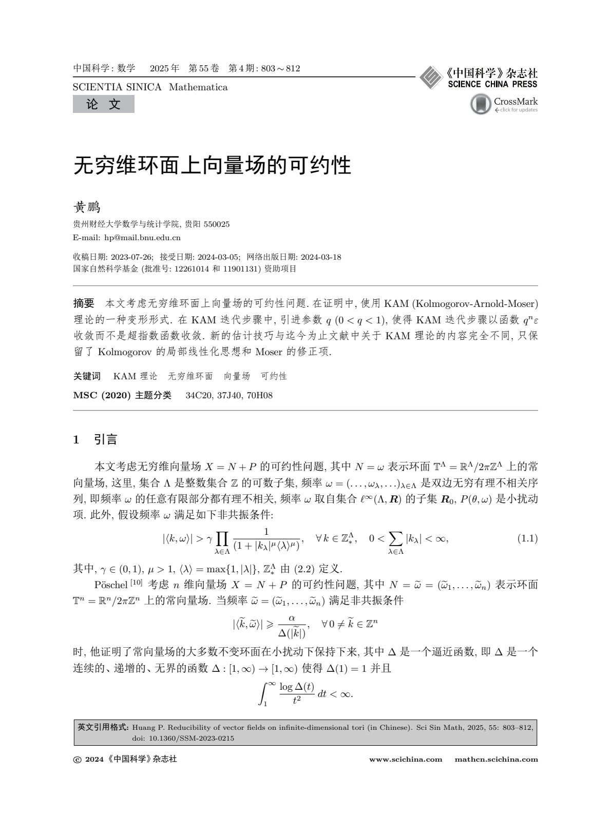 近日,必一运动黄鹏副教授以必一运动体育公司为唯一通讯单位,在期刊《中国科学:数学》上发表了题为“无穷维环面上向量场的可约性”的研究论文。