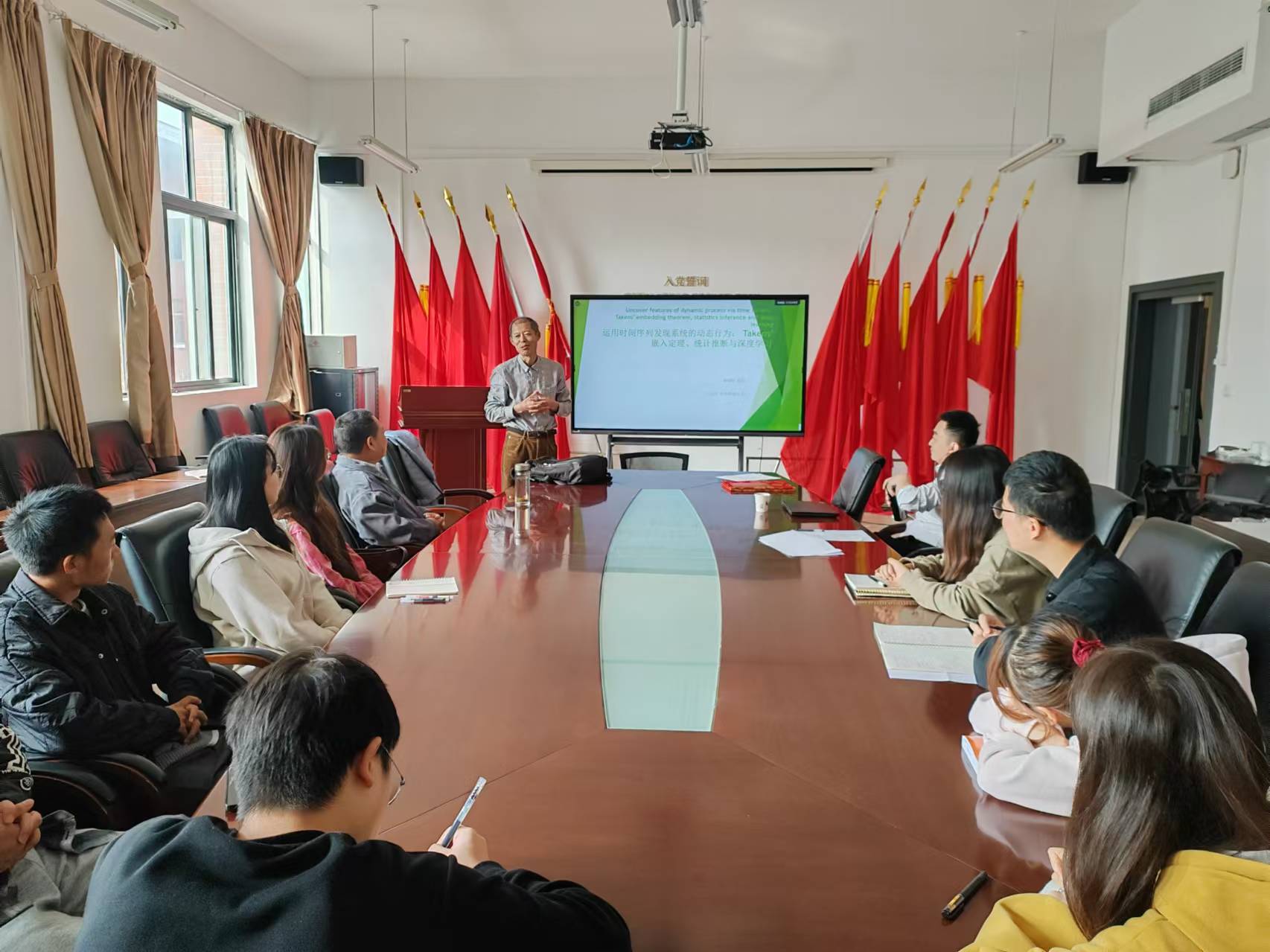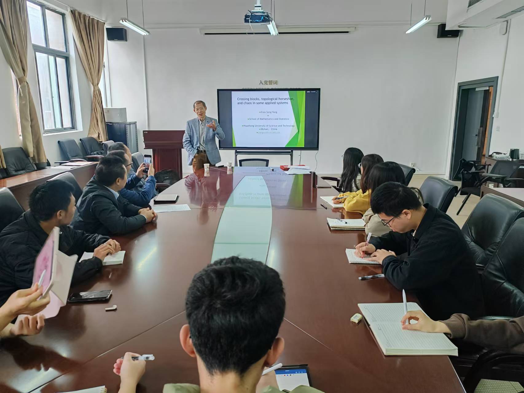 11月7日下午,杨晓松教授以《Crossing blocks, topological horseshoe and computer studies on complex systems为题,首先详细介绍了交叉块和拓扑马蹄理论,接着展示了如何基于交叉块和拓扑马蹄理论证明几个应用非线性系统中的混沌。最后,杨晓松教授就师生所提出的问题进行了认真的回答和交流,让大家受益匪浅。