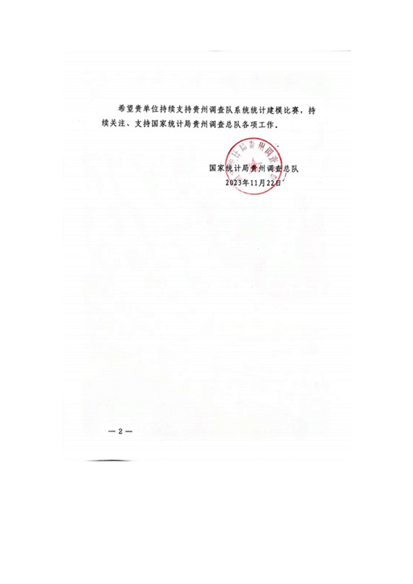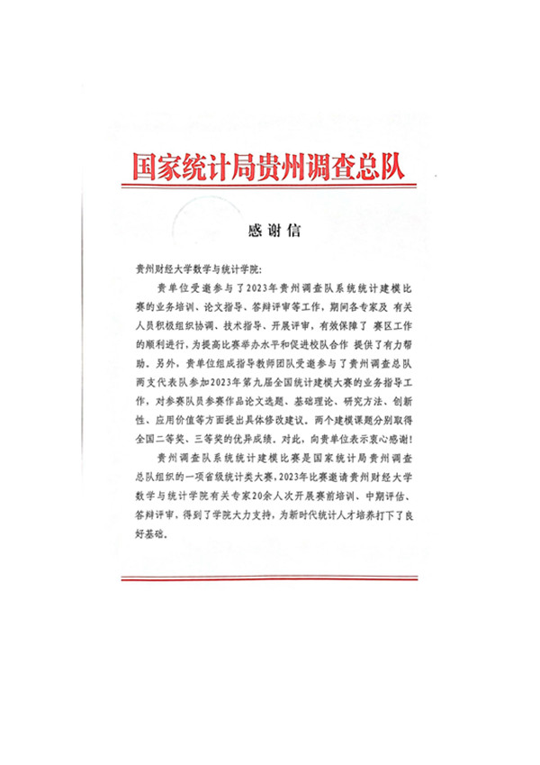 近日,公司必一运动收到国家统计局贵州调查总队的感谢信,来信对公司必一运动在2023年第九届全国统计建模大赛和2023年贵州调查队系统统计建模比赛中给予的帮助表示感谢。