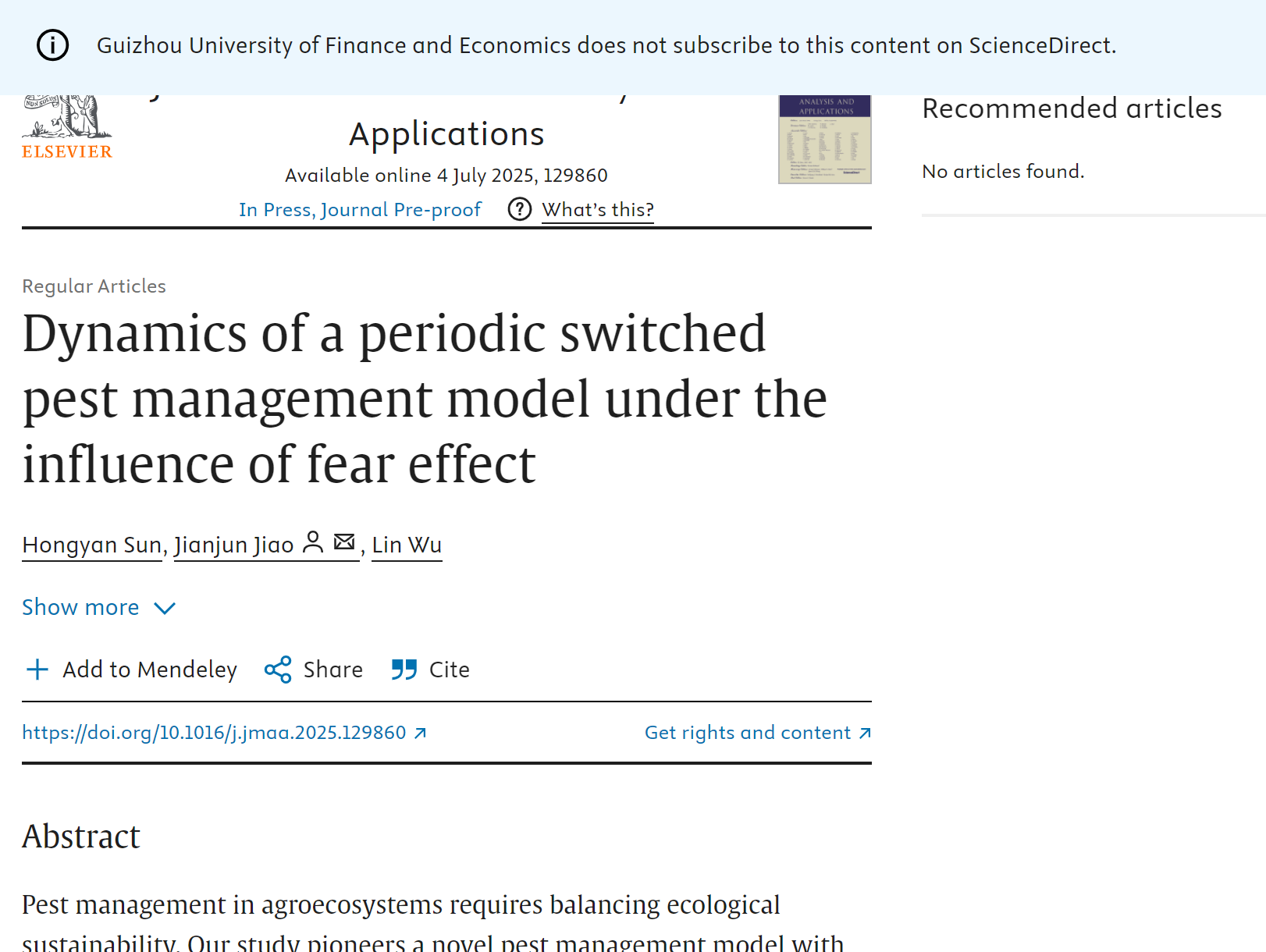 近日,2023级应用数学专业硕士研究生孙红艳同学以第一作者身份在中国科公司SCI三区期刊《Journal of Mathematical Analysis and Applications》(影响因子1.2)上发表题为《Dynamics of a periodic switched pest management model under the influence of fear effect》的研究性论文。该论文以必一运动体育公司为第一完成单位,焦建军教授为通讯作者。