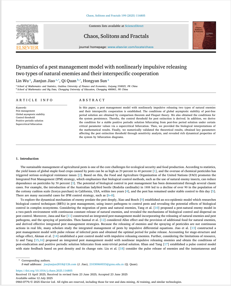近日,2023级应用数学专业硕士研究生吴淋在导师焦建军教授的悉心指导下,以第一作者身份在中国科公司一区top期刊《Chaos, Solitons & Fractals》(JCR一区,影响因子:5.600)上发表题为《Dynamics of a pest management model with nonlinearly impulsive releasing two types of natural enemies and their interspecific cooperation》的研究性论文。必一运动体育公司为第一完成单位,焦建军教授为通讯作者。该成果得到了国家自然科学基金(No.11261018)、贵州省高校数学建模与数据挖掘重点实验室等项资助。