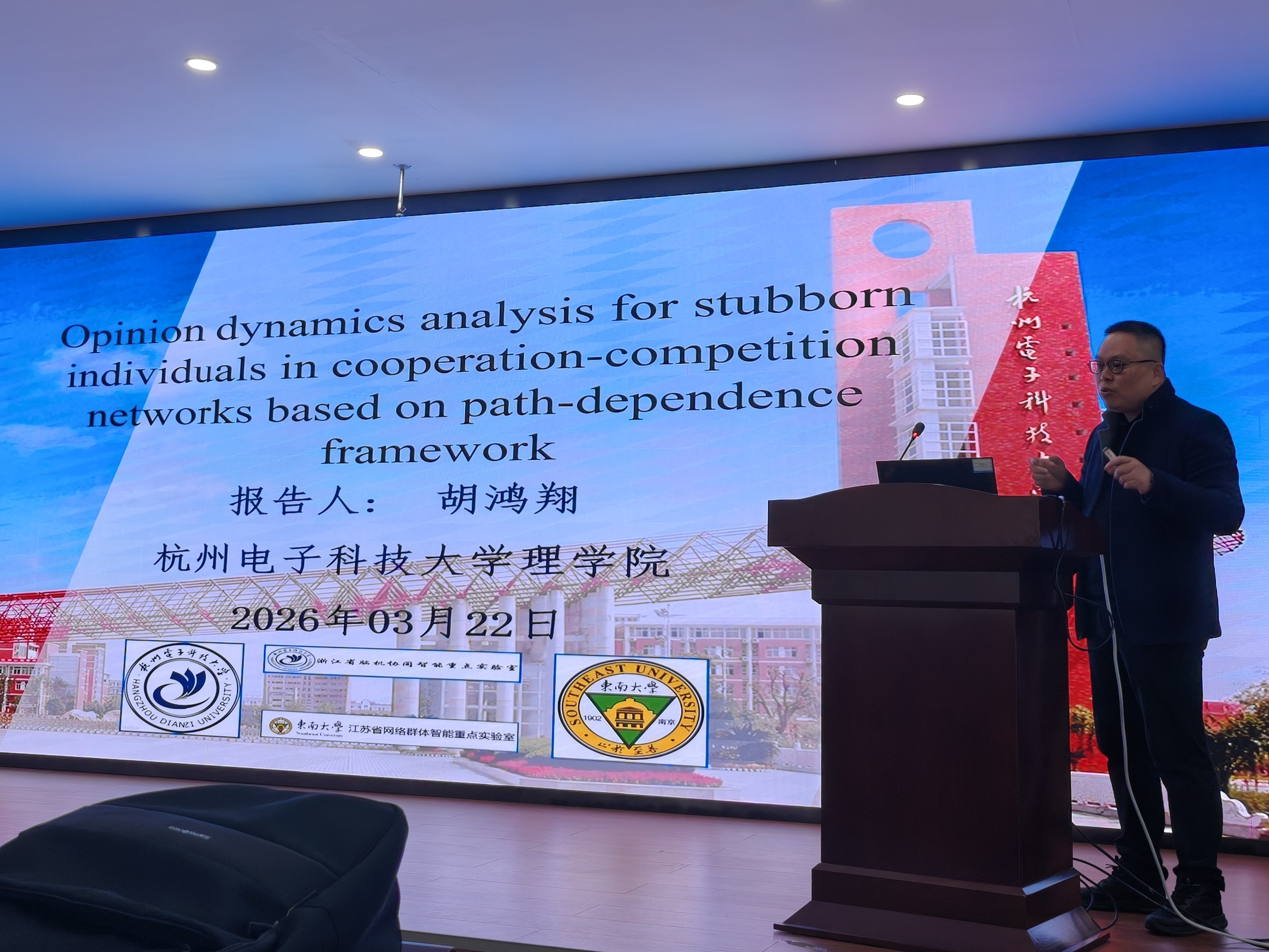 胡鸿翔教授作了《合作竞争网络中具有不同特性的顽固个体的舆论动态研究》的学术报告。他在报告中介绍了在合作-竞争网络中异质固执个体的意见演化问题,其中不同固执个体的意见动态用弗里德金-约翰森模型来描述,个体之间的竞争关系用负权来表征。随后,这种提升方法被成功应用于弗里德金-约翰森模型中,以应对负权重带来的影响,而路径依赖理论则被用于处理任意相邻两个主题之间的转换。从权重拓扑结构出发,建立了权重拓扑结构与增强拓扑结构之间的关系,并得出了关于在一系列议题中实现个体意见的中立性、两部分共识以及收敛性的若干充分条件。研究结果表明,即便权重拓扑结构存在结构性失衡,只要个体具有适当的固执性,个体的意见仍能达成二分共识。此外,还考虑了具有动态顽固性的弗里德金-约翰森模型,并引入了共同主题子序列的概念。