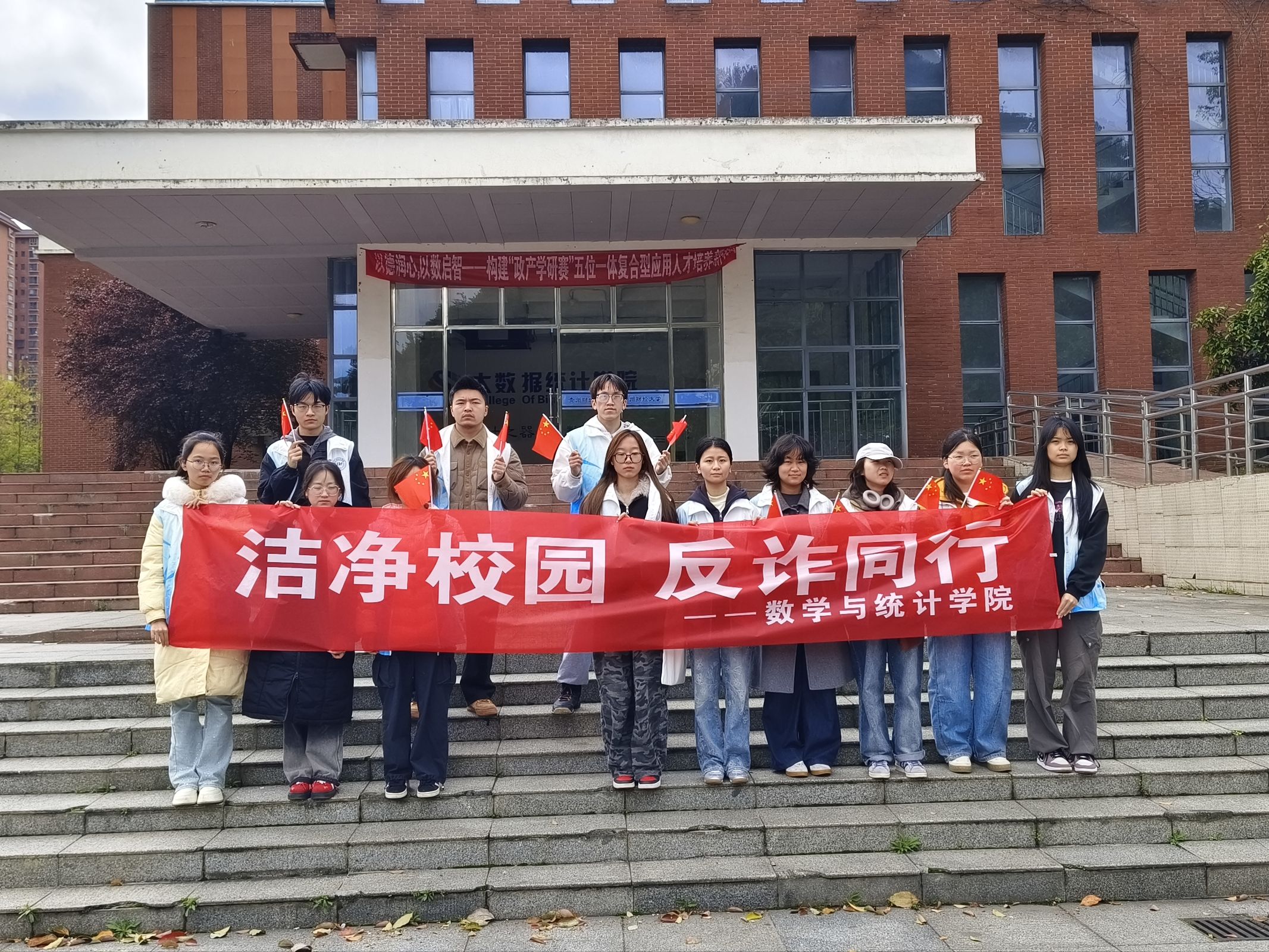 活动中,志愿者们分工协作、有序行动。卫生清扫环节,大家手持扫帚、夹子等工具,对教学楼周边、主干道、绿化带及宣传栏等区域进行全面清理,擦拭公共设施、清除卫生死角,用行动为校园环境“焕新颜”。反诈宣传环节,志愿者们向过往同学发放宣传资料,细致讲解刷单、网贷、冒充客服/老师等高频诈骗类型的防范要点,耐心引导同学们下载国家反诈中心APP,并普及诈骗举报渠道,宣传过程文明规范,获得师生广泛认可。