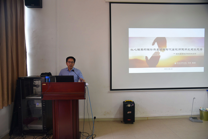 报告会开始时,余孝军对韦煜教授的到来表示热烈的欢迎,并对韦煜教授做了介绍。韦煜从心理契约理论中责任关系,探讨教师个体和公司组织方面在公司师德建设中的所担负不同的角色和责任。提出基于心理契约理论如何推进公司师德师风建设的一些思考。结合国外先进高等教育理念在师德师风建设与实践中的一些值得我们学习经验,联系到我国高等教育,特别是中西部高等教育建设和发展中存在的问题及师风问题,从心理契约角度对自豪与自信、责任与使命、特色与优势等方面详细阐述了师德师风建设给我们的启示。