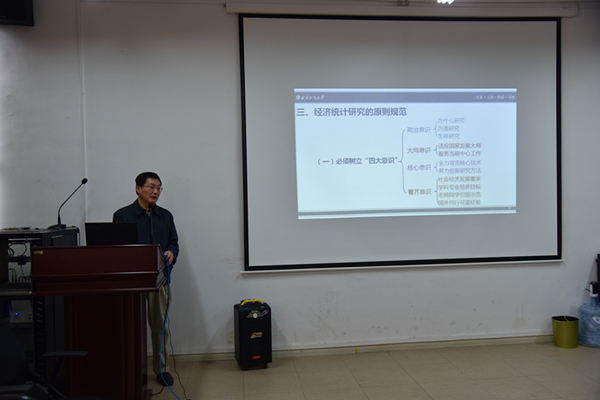 李朝鲜以“经济统计研究的方法论”为题,做了一场内容详实、生动有趣的学术报告,向师生们介绍了经济统计研究者的素质要求、辩证逻辑、原则规范及课题简介等。李朝鲜认为素质要求中应强调“红、专、特”,辩证逻辑中强调实事求是的思想方法、“质→量→质”的认知过程、真题真做的科学态度、小题大做的研究思路、深入浅出的技术路线、死去活来的坚韧意志。李朝鲜还对经济统计研究的原则规范进行了归纳和讲解。